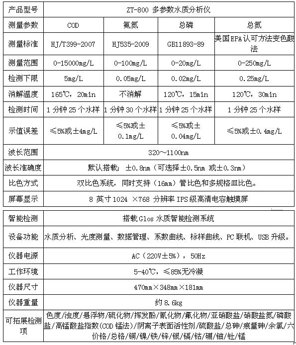 产品概述 出⾊的光学结构和进⼝钨灯光源, 使得ZT-800光学性能稳定,检测结果准确。ZT-800搭载Glos⽔质⽔质智能检测系统,每秒可进⾏⼏⼗次的数据均化计算。检测结果⾃动打印、批量检测、引导检测模式等功能。8英⼨IPS超⼤触摸屏,让测量结果直观明了。可检测COD、氨氮、总磷、总氮、重⾦属等40多种检测参数。产品内置⽔质分析、光度测量、系数曲线、样品曲线、等多种应⽤程序。 产品应⽤ 可⼴泛应⽤于科研院所、污⽔⼯程、⽔环境检测、⽯油化⼯、冶⾦钢铁、⽣物医药、⻝品乳业、⽑纺印染、电⼦机械、⽔产养殖、光伏、⽪⾰、造纸、等领域的⽔质检测。 检测原理 ZT-800多参数⽔质分析仪,常规检测项检测原理:COD的测定采⽤消解管密闭催化消解⽐⾊法,氨氮的测定采⽤纳⽒试剂⽐⾊法,总磷的测定采⽤钼酸铵分光光度法⽐⾊,总氮采⽤变色酸法比⾊,选定⽔质检测项⽬,光源发射信号⾄传感器,经RAM处理器进⾏数据的运算处理,直接计算出样品浓度值,以单位mg/L显示。 产品特点 进⼝钨灯光源,光学性能稳定,检测结果准确。 测定仪和消解仪采⽤分体式设计,不影响光源系统和光学传感器的稳定性。 搭载Glos⽔质智能检测系统、每秒⼏⼗次的数据均化计算。 检测结果⾃动打印、批量检测、引导检测模式等功能。 搭配双⽐⾊系统,同时⽀持(16mm)管⽐⾊和多规格⽫⽐⾊。 8 英⼨1024 ×768 分辨率IPS级⾼清电容触摸屏。 ABS材质,⾼强度、耐腐蚀、耐⾼温外壳。 配备预制试剂,只需要在试管内添加污⽔样品再经过消解即可进⾏检测。 ⽀持COD、氨氮、总磷、总氮、⾊度、浊度、悬浮物、重⾦属等40多种检测参数。 技术参数